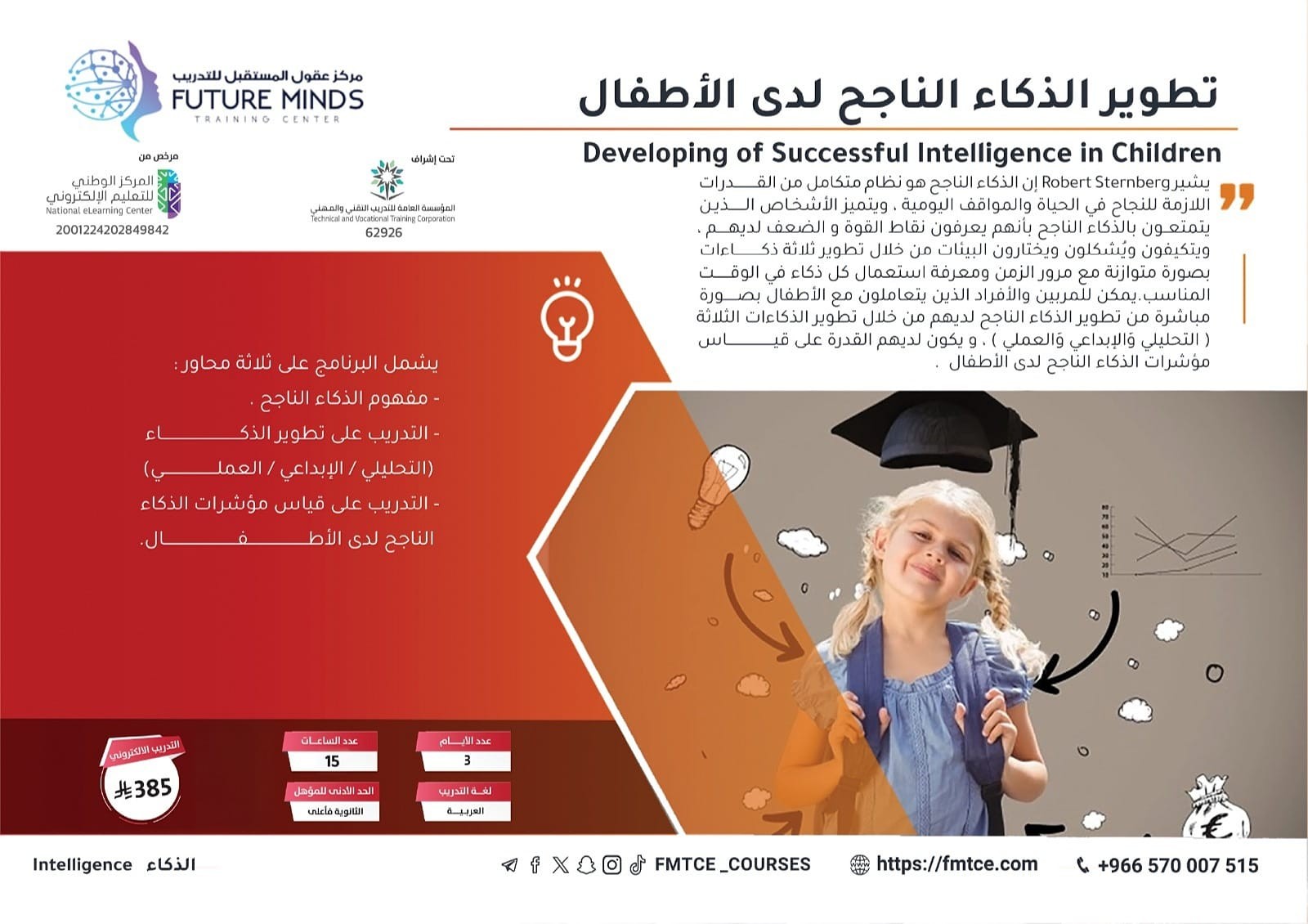 يعتمد البرنامج على ثلاث محاور متكاملة يجب أن يتقنها المتدرب للتعامل مع الأطفال و يكون لديه القدرة على تشخيص و قياس الذكاء لديهم . وهي : * الإلمام بالأ...