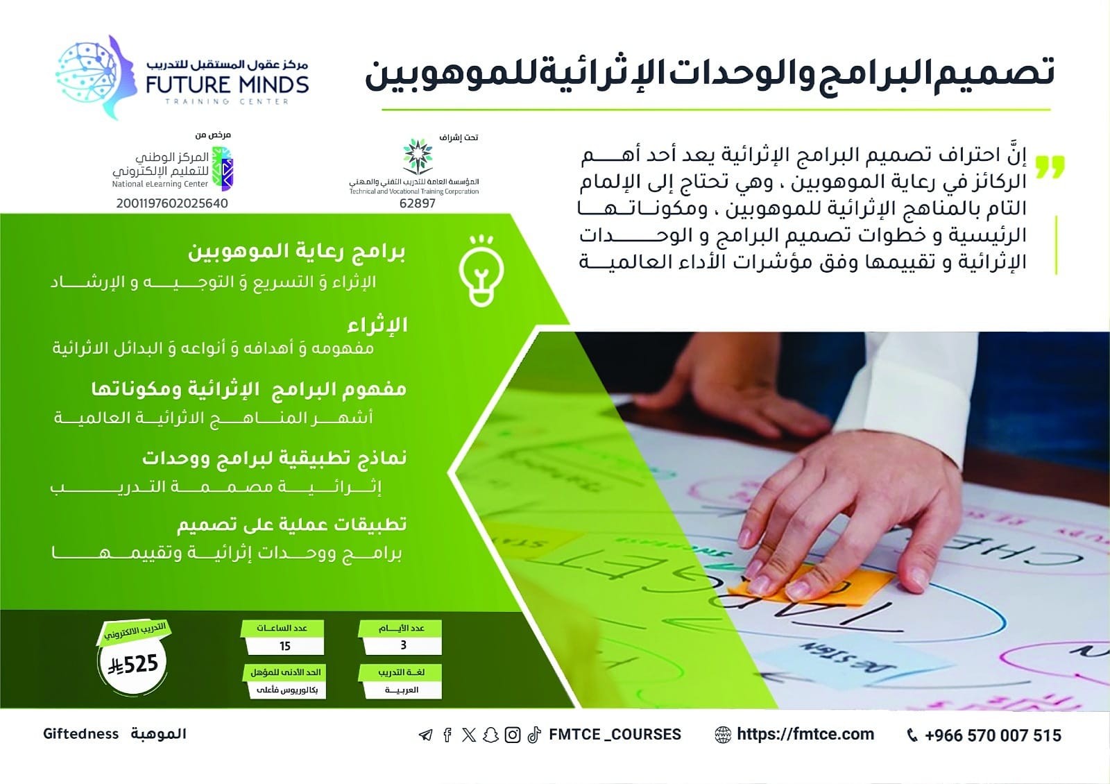 إن احتراف تصميم البرامج الإثرائية يعد أحد أهم الركائز في رعاية الموهوبين ، وهي تحتاج إلى الإلمام التام بالمناهج الإثرائية للموهوبين ، ومكوناتها الرئيس...