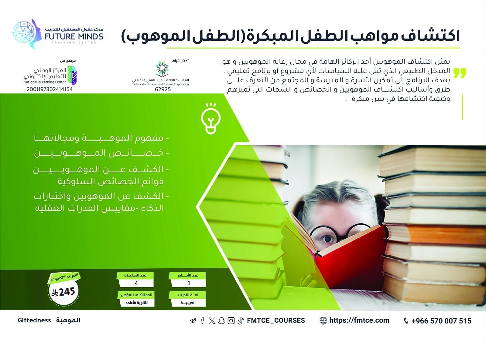 يهدف البرنامج إلى تمكين األسرة و المدرسة و المجتمع من التعرف على طرق وأساليب اكتشاف الموهوبين و الخصائص و السمات التي تميزهم و كيفية اكتشافها في سن مب...