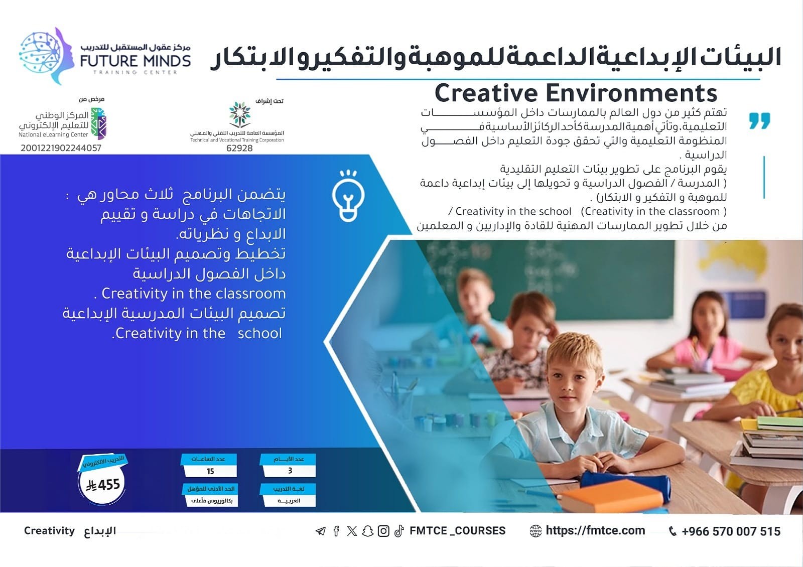 يقوم البرنامج على تطوير بيئات التعليم التقليدية ( المدرسة / الفصول الدراسية ) و تحويلها إلى بيئات إبداعية داعمة للموهبة و التفكير و الابتكار ( Classro...