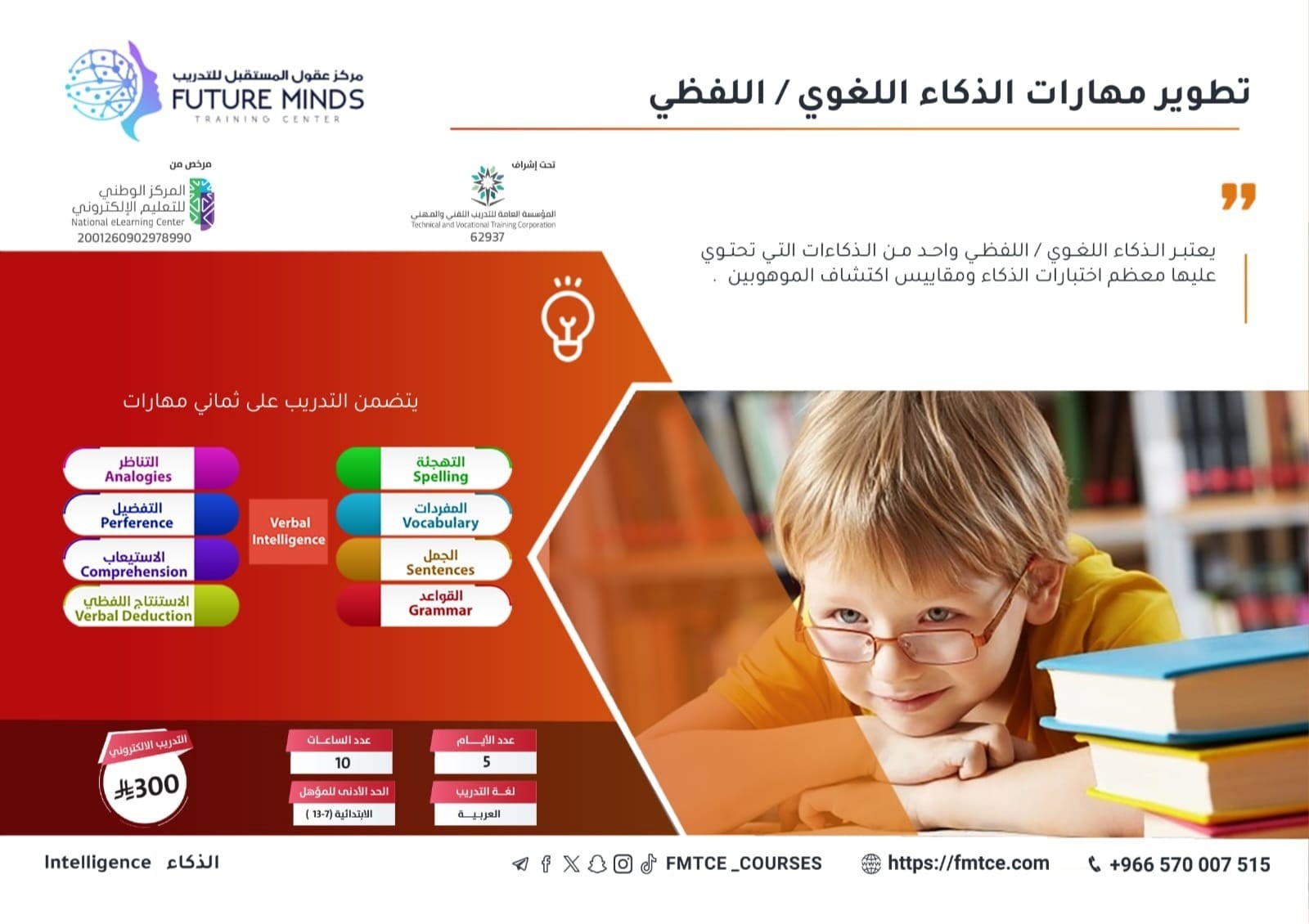يعتبر الذكاء اللغوي / اللفظي واحد من الذكاءات التي تحتوي عليها معظم اختبارات الذكاء ومقاييس اكتشاف الموهوبين يقوم البرنامج على تطوير مهارات الذكاء الل...