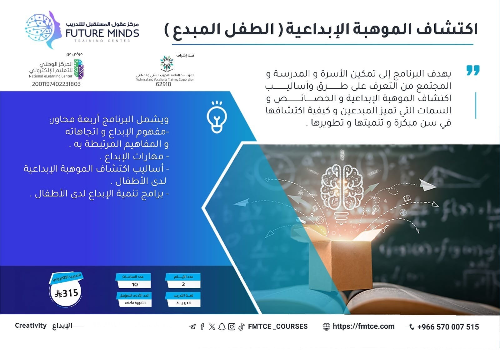 يهدف البرنامج إلى تمكين األسرة و المدرسة و المجتمع من التعرف على طرق وأساليب اكتشاف الموهبة اإلبداعية و الخصائص و السمات التي تميز المبدعين و كيفية اك...